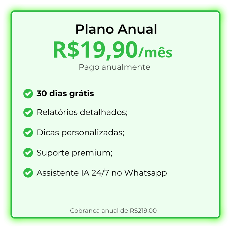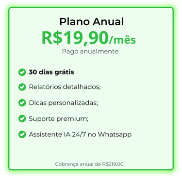 Simples: você usa TUDO por 30 dias sem pagar nada. Pode mandar quantos gastos quiser, usar todos os relatórios, tudo liberado. Só vai ser cobrado depois dos 30 dias se você quiser continuar. Se não gostar, é só cancelar e não paga nada.